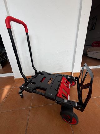 Carretilla plegable versátil, ideal para transportar objetos de forma cómoda. - Estructura robusta de metal y plástico. - Ruedas resistentes para facilitar el movimiento. - Asa ergonómica con agarre rojo. - Diseño compacto para almacenamiento. Nuevo sin sacar de la caja, a estrenar.