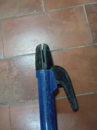 Pinza para soldar de color azul y negro. - Mango de plástico azul. - Mordazas de metal negro.