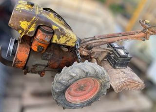Motocultor de color naranja, ideal para trabajos en huertos o jardines. - Motor de combustión. - Ruedas de goma. - Manillar ajustable.