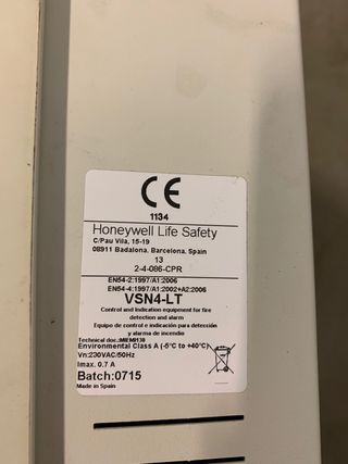 Centralita de alarma de incendios Honeywell VSN4-LT en buen estado. - Marca: Honeywell Life Safety - Modelo: VSN4-LT - Referencia: 1134 - Cumple con EN54-2, EN54-4 - Incluye manual de instrucciones.