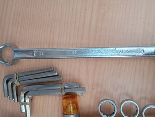 Juego de herramientas nuevas - Incluye llaves inglesas, llaves Allen y martillos. - Las herramientas muestran señales normales de uso. - Ideal para trabajos de mecánica o bricolaje.