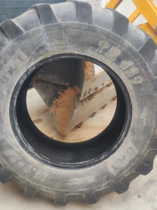 Neumático industrial BKT para maquinaria pesada. - Modelo: TR 459 - Medida: 16.9-28 - Construcción: Diagonal Está más gastado de un lado. Aún le queda uso, sobre todo si se monta en un tractor ya que es un neumático de retroexcavadora.