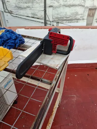 Sierra eléctrica con motor. - Mango ergonómico para un mejor agarre. - Protector de cadena. - Cable de alimentación rojo.