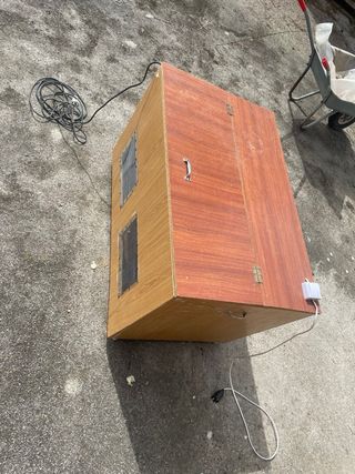 cajón para criar pollos de todo tipo. cuenta con 3 bombillas(2 normales y 1 de Led) con interruptor y otra bombilla de calor. cuenta con cable de 4metros, bastante largo y tiene 4 ruedas para fácil transporte.