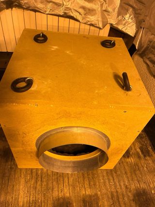 Extractor Iso-Box con una capacidad de 700 metros cúbicos por hora. Ideal para ventilación. - Construcción en madera. - Conexión circular para conductos. - Incluye ganchos para colgar.