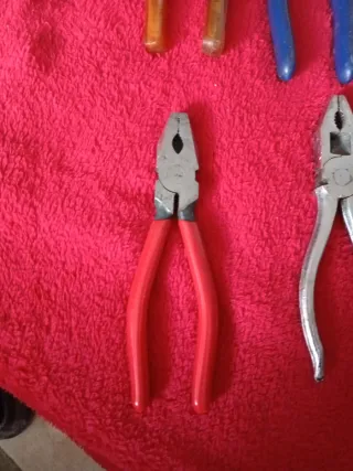 Lote de cuatro alicates de diferentes tipos y colores. Ideales para trabajos de bricolaje o reparaciones. En mi armario tengo más herramienta, martillos, tornillos, tiradores,etc. Se puede hacer un lote
