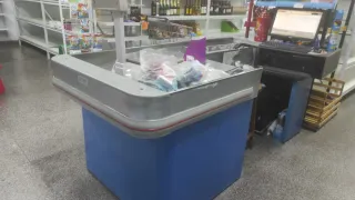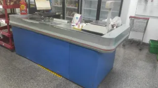 Mostrador de supermercado con acabado metálico y base azul. - Diseño robusto. - Superficie de trabajo amplia. - Medidas del mostrador: Largo 2'30m Alto 90cm Ancho 1m Está en buen estado. No se envía debido a su volumen y peso.
