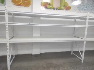 Estanterías metálicas con acabado en lacado blanco de gran capacidad, ideales para supermercados o almacenes. - Estructura robusta y duradera. - Múltiples baldas para organizar productos. - Diseño abierto para fácil acceso. - Con las estanterías van incluidos los tablones blancos de madera. Medidas de largo: 2,82m Medidas de ancho: 81cm Medidas de alto: 2m