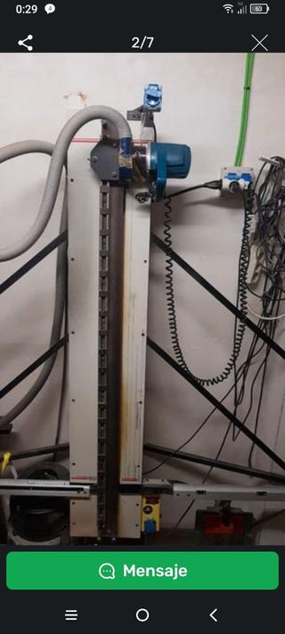 Sierra vertical para tableros ( d'Ibon, metacriilato, etc.) de màxima altura 124 cm...tope/regla lateral derecha, motor para circular de vida, contrapesos, para clavar a pares. Esta maquinaria nunca pasa de moda y hace la funcion.