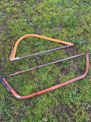 Herramientas de jardinería para cortar ramas y madera. - Sierra de arco naranja. - Serrucho con mango rojo.