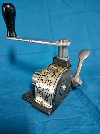 Máquina manual para estrujar uvas, ideal para la vendimia. - Construcción en acero inoxidable. - Mecanismo de engranajes para facilitar el uso. - Tolva amplia para la fruta.