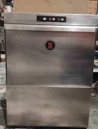 Lavavajillas industrial Sammic modelo P-50 Con muy poco uso. Bomba de detergente y abrillantador DINO. - Fabricado en acero inoxidable. - Panel de control con botones. - Logo de la marca Sammic en el frontal.