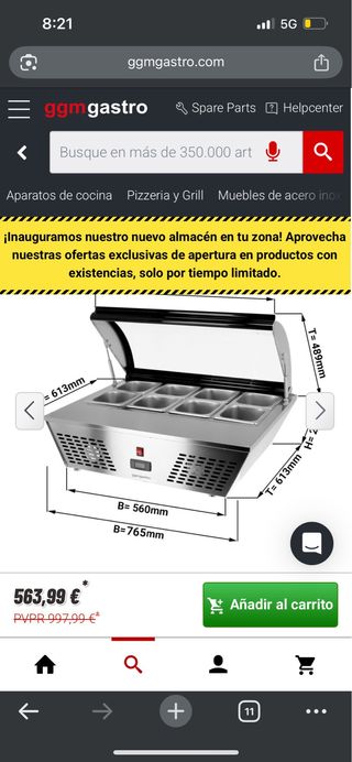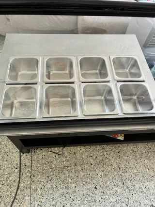 Vendo vitrina expositora refrigerada de acero inoxidable, ideal para negocios de hostelería. Está en muy buen estado, solo usada 2 meses y es perfecta para mantener productos refrigerados. - Medidas: 613x560x765mm (AltoxAnchoxFondo) - Capacidad para 6 cubetas GN 1:2 - Tapa acristalada.