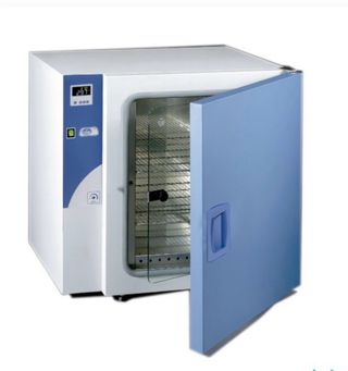Estufa para bacteriología y cultivos. Diseño moderno en blanco y azul. - Puerta frontal con asa. - Interior con rejillas metálicas.
