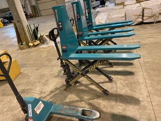 Carretilla elevadora de tijera marca Jungheinrich, modelo PTM 1.01. - Capacidad de carga de 1000 kg. - Color verde azulado. - Diseño de tijera para elevación.