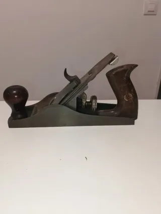 Cepillo de carpintero de estilo antiguo, con mango de madera y detalles metálicos. - Cuerpo principal de metal. - Mango delantero de madera oscura. - Mango trasero de madera con forma ergonómica.