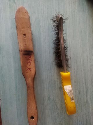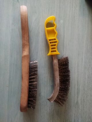 Se venden dos cepillos de púas metálicas, uno con mango de madera y otro con mango de plástico amarillo. - Mango de madera. - Mango de plástico amarillo.