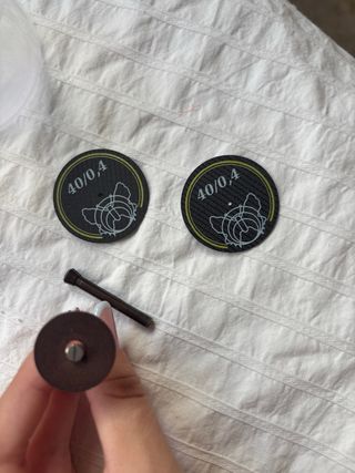 Dos discos de fresa de mandril en buen estado. Son de color negro con detalles en verde claro. Incluyen dos vástagos, uno metálico y otro oscuro. Ideales para trabajos de precisión. - 2 discos de fresa de mandril 40/0,4 - 1 vástago metálico - 1 vástago oscuro