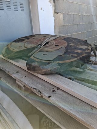 Quinta rueda de camión, pieza robusta y duradera. - Fabricada en metal resistente. - Diseño circular con puntos de anclaje. - Superficie con marcas de uso. En buen estado. Ideal para acoplar a carretilla elevadora y poder mover remolques