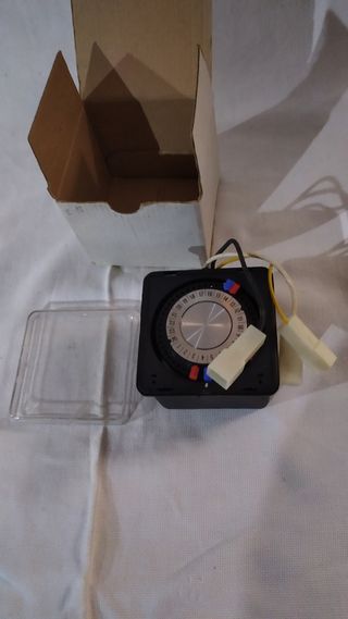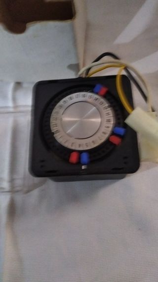 Programador industrial con dial de 24 horas. - Dial con números del 1 al 24. - Indicadores de tiempo en rojo y azul. - Conexiones eléctricas. - Incluye tapa protectora transparente.
