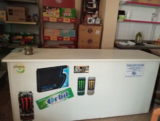 Mostrador blanco, ideal para negocios. - Superficie lisa. - Adhesivos decorativos incluidos: Donuts, Monster Energy (2 latas), Orbit y 5 Cobalt. - Cartel informativo en el lateral derecho.