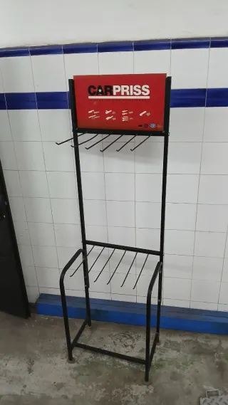 Expositor metálico para escobillas de limpiaparabrisas. - Estructura negra metalica - Panel superior rojo con logo CARPRISS y gráficos de herramientas. - Múltiples ganchos para colgar productos. Las medidas estan en las fotos. No envio