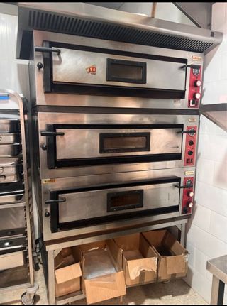 Horno profesional Apoza trifásico con capacidad para 9 pizzas de 30cm. - Tres niveles independientes. - Puertas con ventana de cristal. - Controles de temperatura por nivel.
