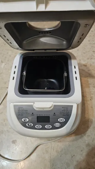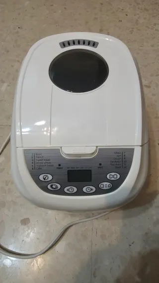 Panificadora blanca con varios programas. - Programas: Basic, French, Sweet bread, Whole wheat, Yogurt bread, Cake, Whisk, Jam, Dough, Sandwich, Free bake, Bake. - Pantalla digital. - Panel de control con botones.
