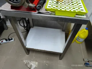 Mesa de trabajo de acero inoxidable, ideal para cocinas o talleres. Medidas: Alto: 0'80 Ancho: 0'60 Fondo: 0.45 - Estructura robusta de acero. - Superficie lisa y fácil de limpiar. - Estante inferior para almacenamiento adicional.