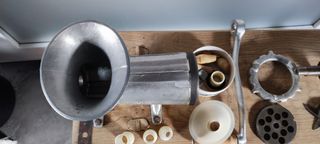 Máquina de picado y embutido ELMA con accesorios, instalada en un banco. Se regalan 2 bateas.
