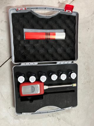 Herramienta para remachar, de color rojo y amarillo. - Cuerpo de aluminio. - Mangos recubiertos de plástico amarillo.