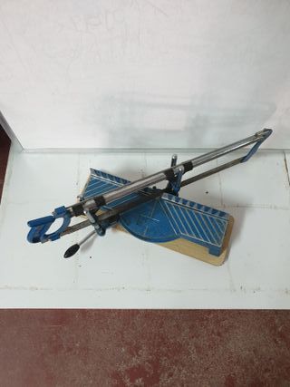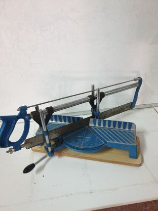 Herramienta de corte manual de color azul. - Base de madera. - Guías metálicas para el corte.