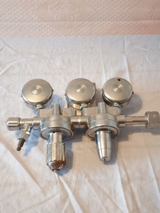 Regulador de presión de oxígeno marca Oxilinde. Cuenta con tres manómetros para control de presión. - Manómetro de alta presión (0-300 bar). - Manómetro de baja presión (0-12 bar). - Manómetro intermedio (0-30 bar). - Cuerpo de latón. - Válvula de ajuste.
