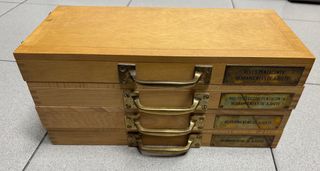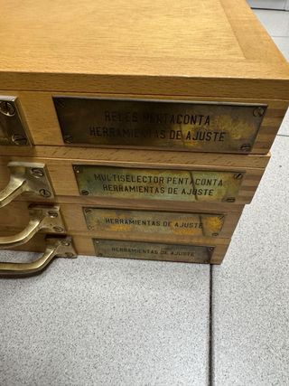 Caja de madera con varias herramientas de ajuste. - Incluye relés y multiselectores Pentaconta. - Placas de identificación en cada cajón. - 4 cajones en perfectas condiciones. A recoger en Tres Cantos o Sanchinarro.