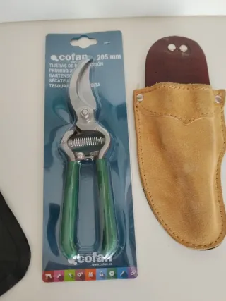 Tijeras de podar de la marca Cofan, con una longitud de 205 mm. - Mango de color verde. - Incluye funda de cuero para cinturón.