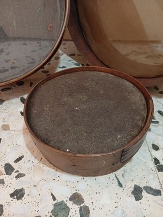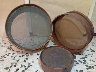 Conjunto de tres tamices de madera con malla de las monjas. Estilo antiguo. - Tamiz grande con malla fina. - Tamiz mediano con malla gruesa. - Tamiz pequeño con base sólida.
