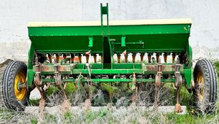 Se vende sembradora agrícola en buen estado. - Estructura metálica robusta. - Ruedas para desplazamiento. - Depósito para semillas.