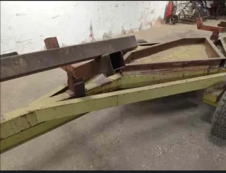 Cosechadora de patatas diseñada para la recogida manual. Su estructura naranja metálica es robusta y está pensada para facilitar las labores agrícolas. - Mecanismo de cribado con barras metálicas. - Rueda lateral para desplazamiento. - Enganche para tractor o vehículo agrícola.