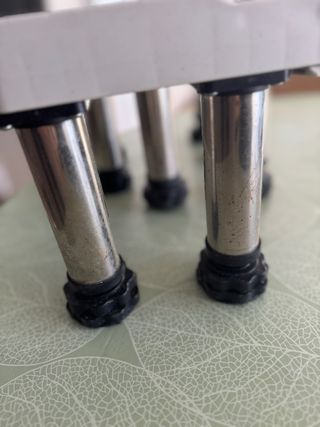 Juego de patas elevadoras ajustables para muebles. Permiten elevar la altura de tus electrodomésticos o muebles. - Material: Plástico y metal. - Color: Beige y negro. - Ajustables en altura.