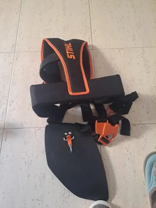 Arnés universal de la marca STIHL, diseñado para ofrecer comodidad y soporte. - Color negro con detalles en naranja. - Diseño ergonómico para distribuir el peso.