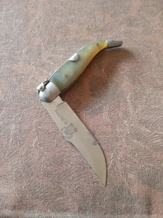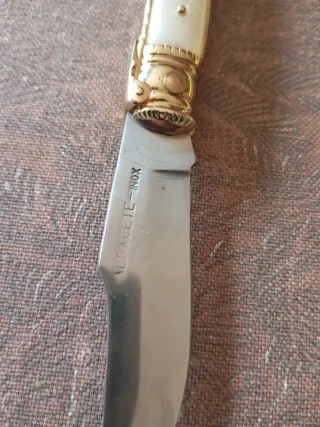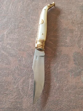 Herramienta de bolsillo con un diseño elegante y detalles dorados. - Mango de nácar blanco. - Hoja de acero inoxidable. - Grabado 'ALBACETE-INOX' en la hoja.