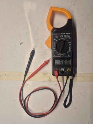 Medidor digital con pinza amperimétrica Electro data hold DH, modelo 60.144. Está en perfecto estado. - Permite medir corriente alterna y continua. - Modelo: 60.144 - Certificación: CE CAT II 600V - Incluye cables de prueba.