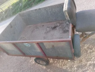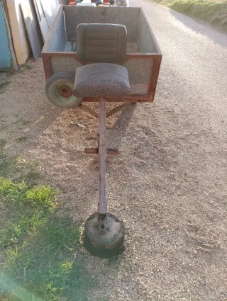 Remolque agrícola diseñado para mulilla mecánica. Cuenta con un asiento para el conductor y una estructura metálica. - Asiento acolchado. - Rueda de repuesto. - lleva freno