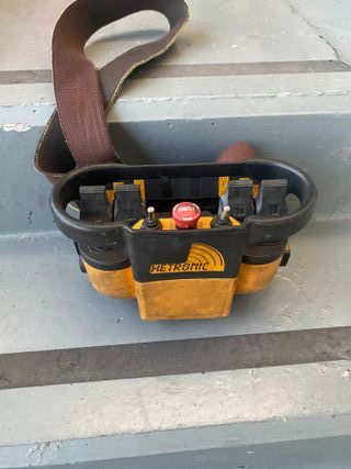 Mando de control remoto HETRONIC para camión grúa o pluma. - Diseño ergonómico. - Botón de parada de emergencia rojo. - Correa de sujeción. - Palancas de control.