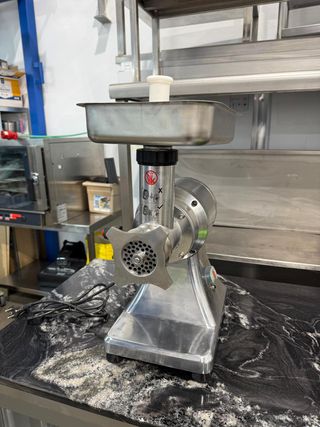 Picadora de carne de uso industrial, fabricada en acero inoxidable. Cuenta con una tolva de gran capacidad y un diseño robusto. - Material: Acero inoxidable. - Diseño profesional. - Incluye empujador. Pica fino con la picadora de carne METRO Professional. La carne picada para hamburguesas, lasañas o deliciosas salsas boloñesas en grandes cantidades son un juego de niños para esta picadora de carne profesional de alta calidad. Gracias al motor eléctrico de 550 W, el aparato tritura hasta 100 kg/h de carne para obtener la más fina carne picada, dependiendo del disco perforado (Ø 70mm) con agujeros de 4,5, 6 y 8 mm de diámetro.
