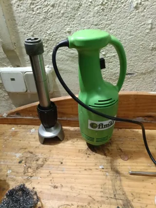 Batidora industrial de la marca Fimar, modelo MX25. Diseñada para uso profesional. El motor funciona perfectamente pero el eje se sale un poco y no engrana, seguro que es fácil de arreglar para quien entienda. - Color verde. - Mango ergonómico.