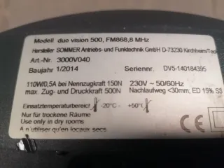 Se vende motor para puerta de garaje SOMMER Duo Vision 500, con sus accesorios. Funciona bien, se ha quitado por cambio de la puerta de garaje. - Incluye el motor principal. - Incluye unidad de control. - Incluye dos mandos a distancia. - Incluye dos sensores. - Incluye manual de instrucciones.