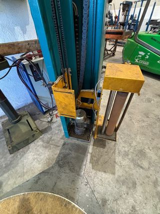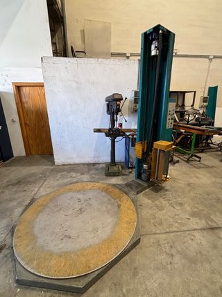 Máquina envolvedora de palets. - Plataforma giratoria circular. - Columna vertical con sistema de envoltura. Matrícula 4115 59/8 Alimentación 380 Ha funcionado correctamente pero lleva mucho tiempo sin usarse, la hemos comprado en un lote de varias máquinas y no la necesitamos. Habrá que hacer una puesta a punto y cambiar algún fusible.... La vendemos tal y como se ve en las fotos.