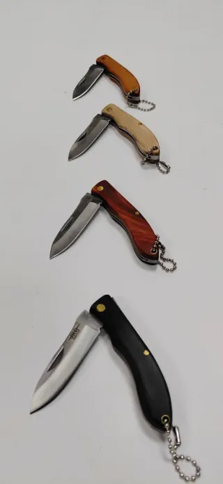 Conjunto de cuatro navajas pequeñas, cada una con cadena para llavero Precio por el lote También se venden sueltas unidad a 6 euros - Variedad de colores y acabados en los mangos. - Diseño compacto y portátil. - Hoja acero inoxidable - Cachas madera - seguro pistón - Largo hoja 6 cm - Largo cachas 8 cm - TODO NUEVO A ESTRENAR - Precio fijo no negociable - Hago envíos - Navajas bolsillo uso diario - Navaja totalmente legal Cudeman, Magnum jkr Boker Alcé