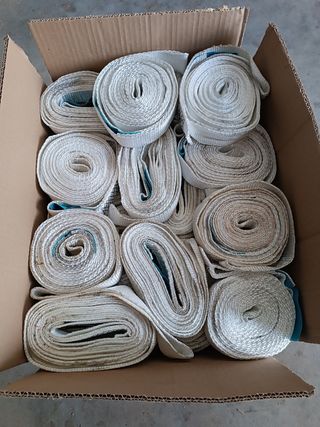 Lote de eslingas de elevación de poliéster. - Color blanco con detalles azules. - Tejido resistente y duradero. - Enrolladas para un fácil almacenamiento. Se hacen lotes de las que se necesiten
